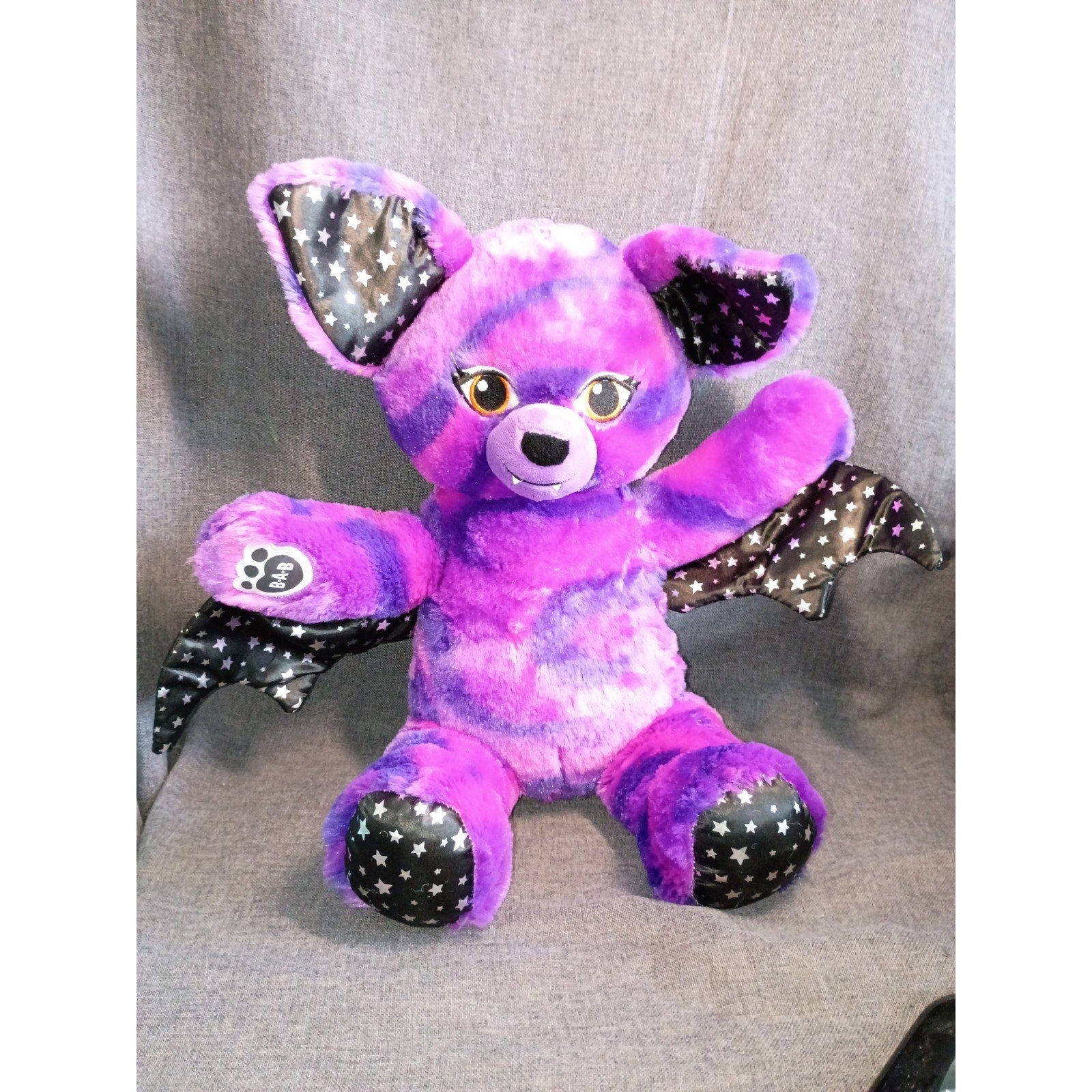 The product is a 16" plush bat from Build-A-Bear Workshop, featuring a Starry Night design perfect for Halloween. This retired item, manufactured in 2017, comes with a dress and is part of the Animals theme. Made of plush material, this purple bat is a unique addition to any collection of bears or Halloween decorations. With its original design and cute appearance, this collectible item is sure to delight fans of the franchise and those who love plush toys.