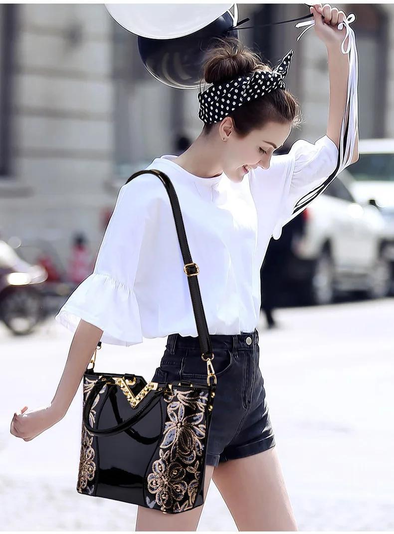 Designer Floral Embroidery Patent Leather Handbag for Women, Large Capacity Shoulder Tote with Zipper Closure, Polyester Lined, Paint Detail, Party Bag