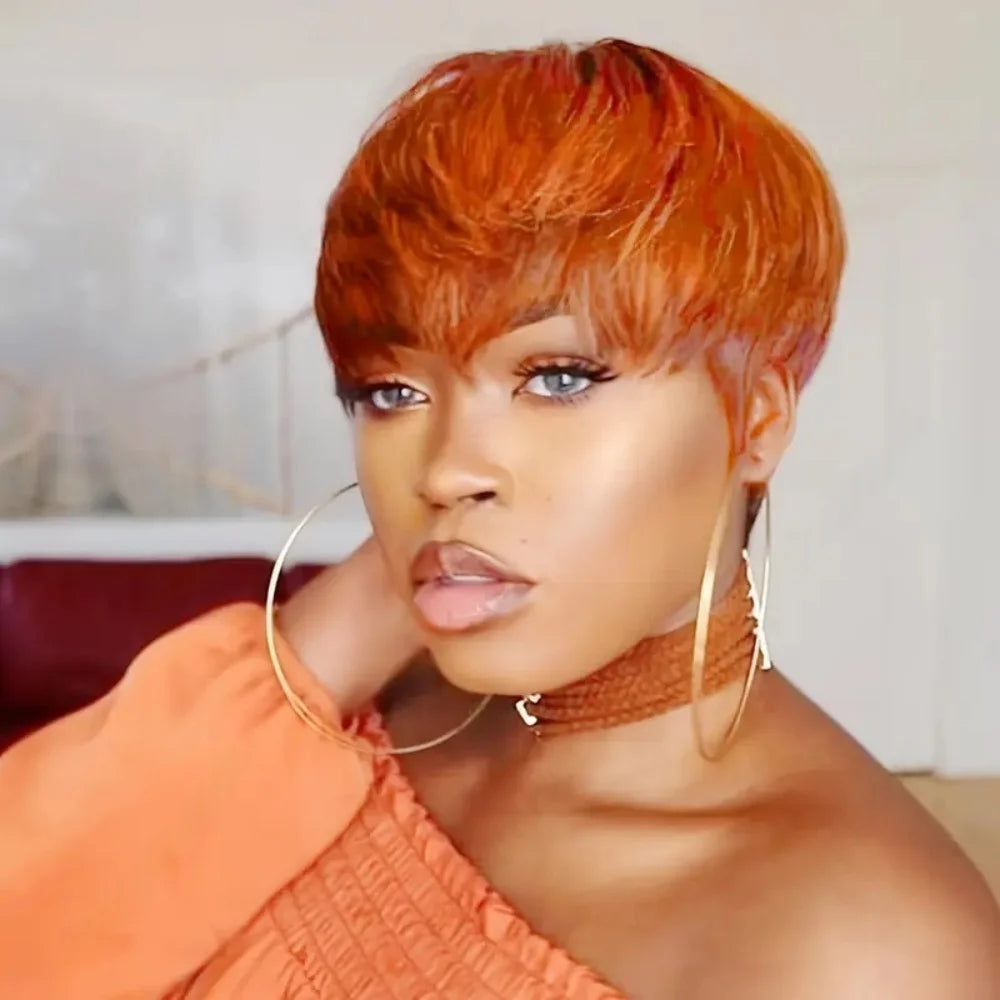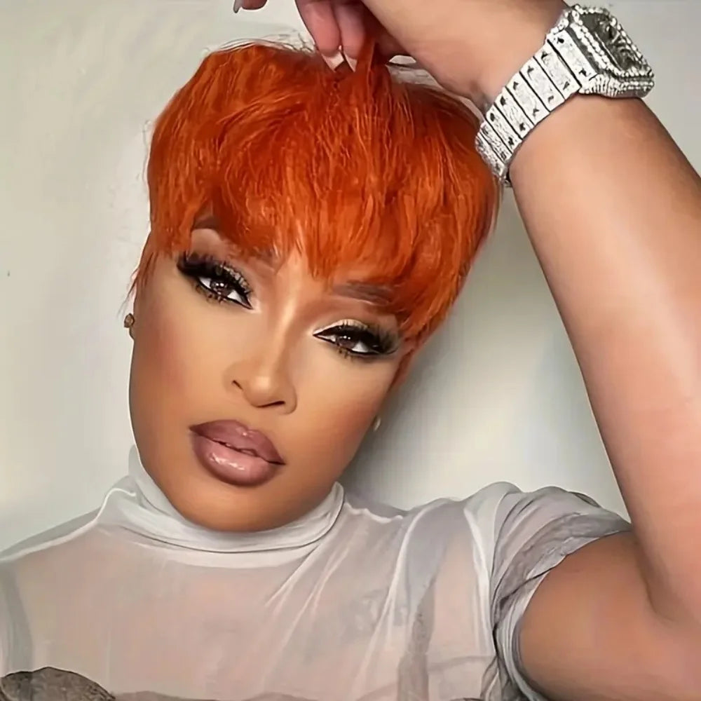 350# Orange Multicolor Pixie Cut Wigs with Bangs Layered Straight Human Hair Wig for Women 350# Natural Mixed Colors Full Machin