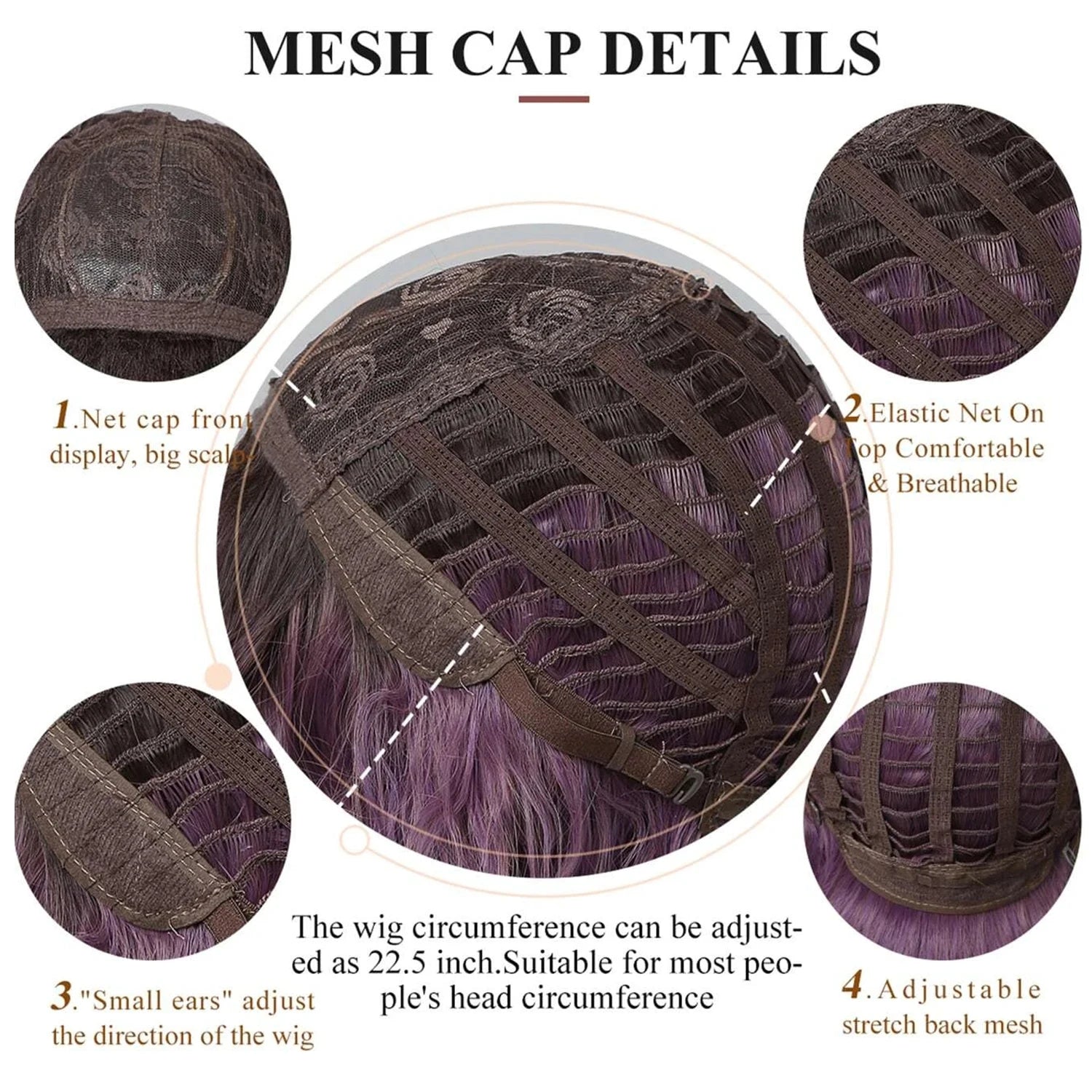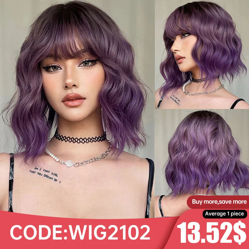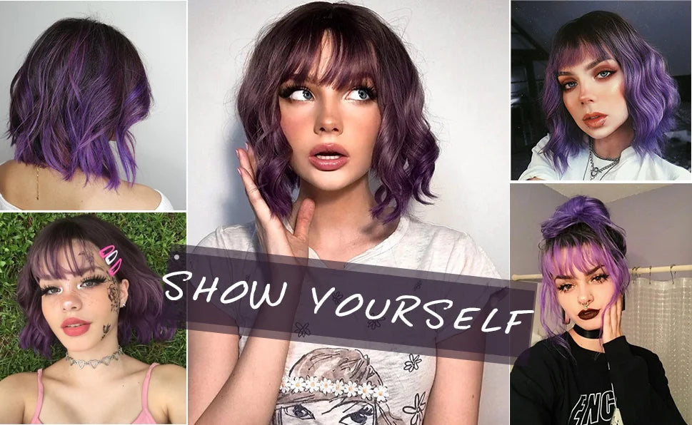 Gray Purple Pink Short Bob Synthetic Wigs with Bangs Curly Cosplay Ombre Wig for Women Afro Natural Wave Heat Resistant Hair