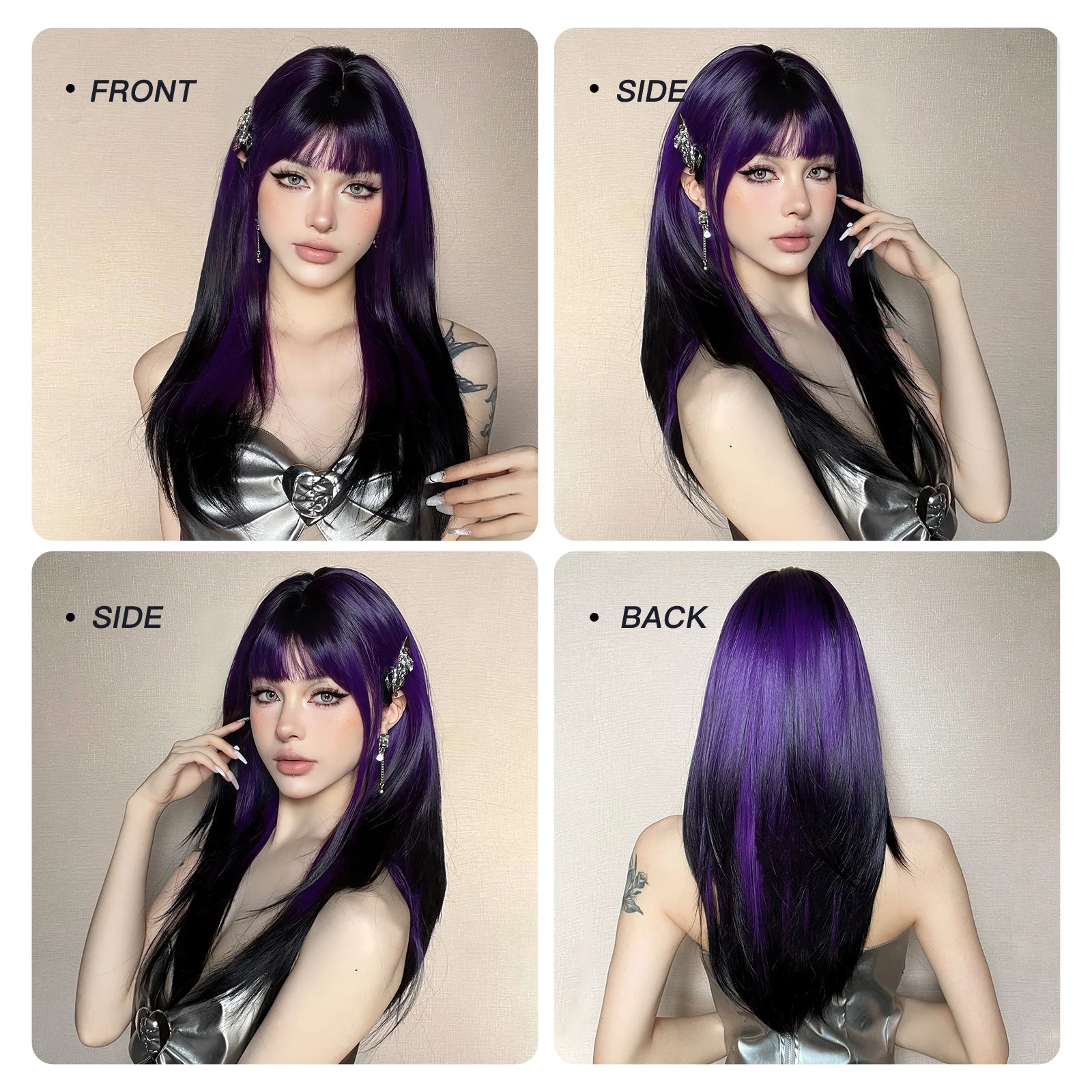 Long Straight Black Purple Synthetic Wig with Bangs Purple Ombre Cosplay Layered Wig for Women Party Heat Resistant Natural Hair