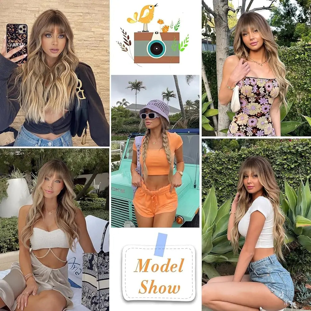 Ombre Light Brown Wigs with Bangs Blonde Highlight Long Curly Wavy Synthetic Wigs for Women Daily Cosplay Party Heat Resistant